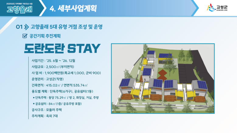 고성군은 이번 사업을 통해 2025년부터 3년에 걸쳐 총 20억 원(국비 10 군비 10)의 예산을 투입, 교육-체험-체류가 연계된 생활인구 기반 유입 모델을 구현할 계획이다. 또한, 농어촌학교를 중심으로 한 아이 동반 가족의 유입을 적극 유도하여, 농촌지역 작은 학교 소멸 위기 등 지역 내 교육 불균형 문제도 개선하도록 교육청을 비롯한 지역사회와의 상생 기반 정착 시스템도 함께 구축해 나간다.