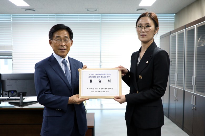 [세종 세계타임즈=이채봉 기자] 세종특별자치시의회(의장 이순열) 2027 하계세계대학경기대회 추진 특별위원회(위원장 김현미)는 6일 어진동에 위치한 조직위원회를 방문하여 조직위원회의 빠른 안정을 촉구하는 성명서를 전달했다.