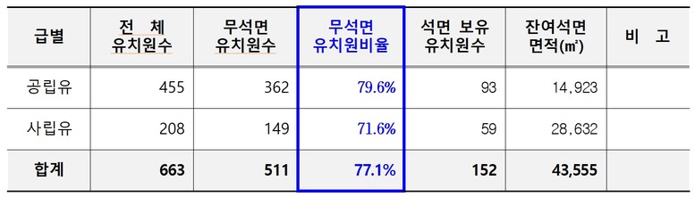 이 자료에 따르면 전체 유치원 663개 원 중 무석면 유치원은 511개 원(77.1%)이며, 석면 보유 유치원은 공립 93개 원(14,923㎡), 사립 59개 원(28,632㎡)이다. 공립 유치원은 교육 예산으로 석면 해체공사를 추진하고 있어서 교육청의 석면 해체공사 계획에 따라서 추진되고 있으나 문제는 예산을 지원할 근거가 없는 사립유치원이다.