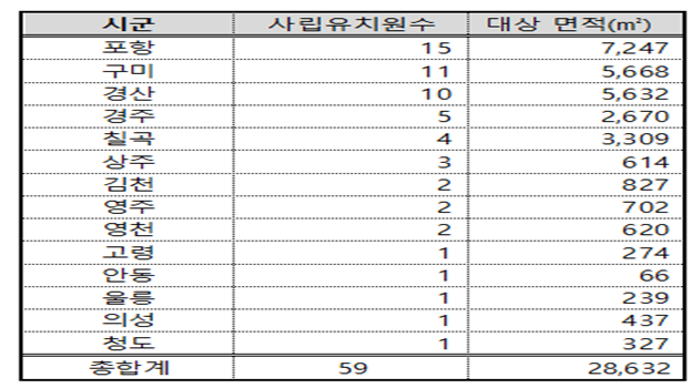 석면 해체 대상 사립 유지원이 가장 많은 시군은 포항(15개원, 7,247㎡), 구미(11개원5.668㎡), 경산(10개 원, 5,632㎡) 등 14개 시군에 59개(28,632㎡) 사립유치원이 포함되어 있다.