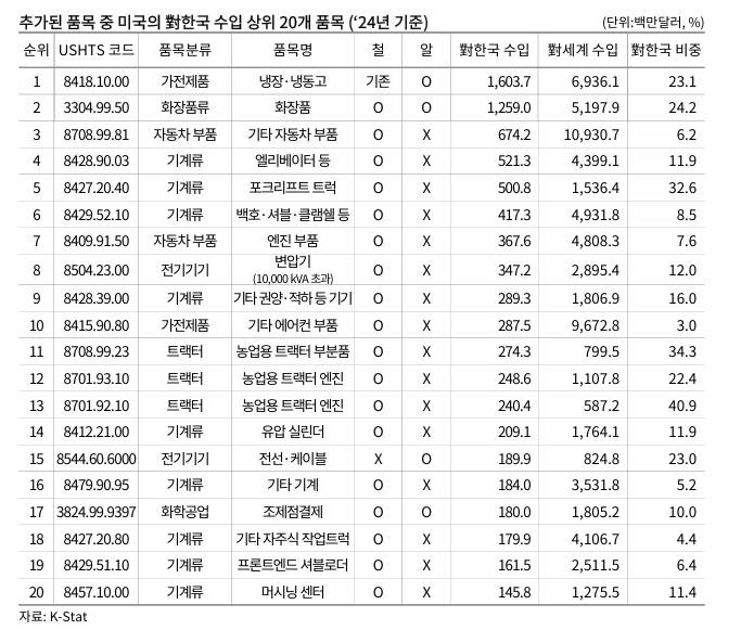 추가된 품목 중 미국의 대한국 수입 상위 20개 품목과 대미 수출 및 한국산 비중