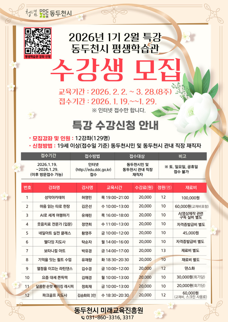 수강 신청은 2026년 1월 19일부터 1월 29일까지이며, 인터넷 접수로만 진행된다. 자세한 사항은 동두천시 평생학습관 홈페이지(https://edu.ddc.go.kr)에서 확인할 수 있다.