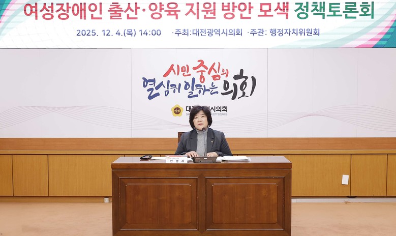 [대전 세계타임즈=이채봉 기자] 대전시의회 행정자치위원회는 4일 시의회 3층 소통실에서 안경자 의원(국민의힘, 비례대표) 주재로 「여성장애인 출산·양육 지원 방안 모색 정책토론회」를 개최했다.