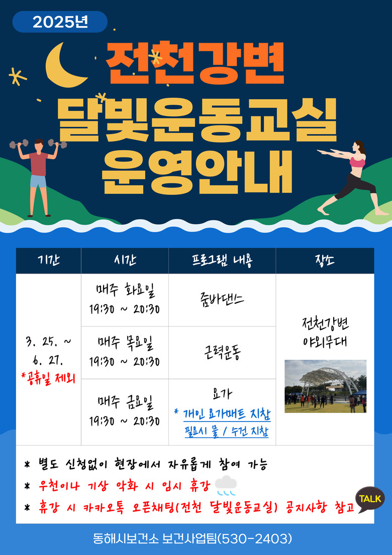 이 프로그램은 3월 25일부터 6월 27일까지 운영되며, 매주 화요일, 목요일, 금요일 저녁 7시 30분부터 8시 30분까지 전천변 야외무대에서 열린다. 전문 강사의 지도 아래 줌바댄스, 근력운동, 요가 등 다양한 건강 운동 프로그램이 진행될 예정이다.