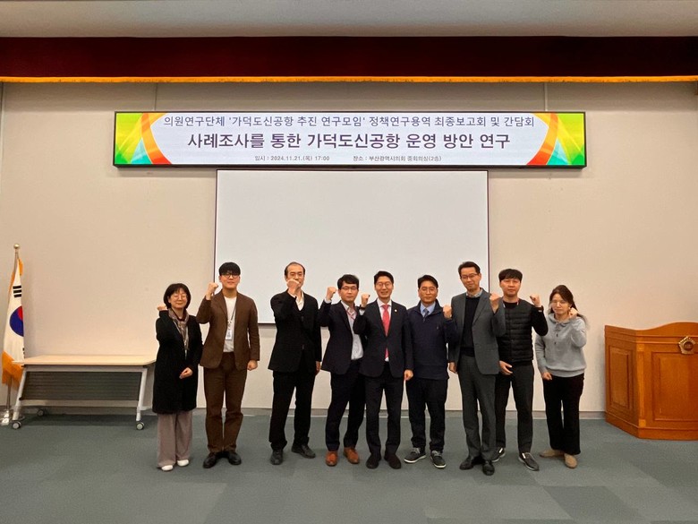 [부산 세계타임즈=이용우 기자] 부산광역시의회 의원연구단체 ‘가덕도신공항 추진 연구모임’은 21일 오후 5시, 부산광역시의회 2층 중회의실에서 ‘사례조사를 통한 가덕도신공항 운영방안’ 연구 용역에 대한 최종보고회와 간담회를 개최하였다.