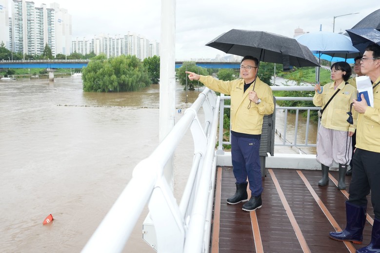 | ▲ 지난해 8월 중랑천 홍수주의보 발표에 따라 긴급 현장 점검을 하는 류경기 중랑구청장 |