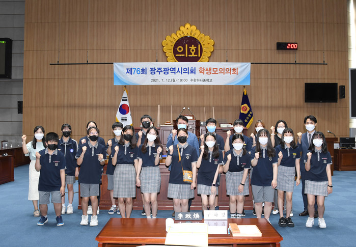 [광주=세계타임즈 손권일 기자] 광주광역시의회(의장 김용집)는 7월 12일(월) 오전 10시에 시의회 본회의장에서 수완하나중학교 학생들을 대상으로 ‘광주광역시의회 제76회 학생 모의의회’를 개최했다.