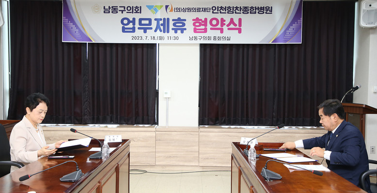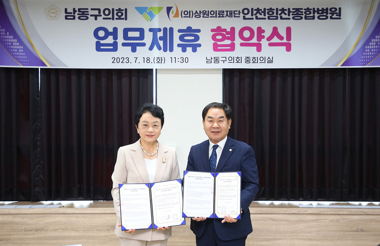 [남동구 세계타임즈=심하린 기자] 남동구의회(의장 오용환)와 인천힘천종합병원(병원장 김봉옥)은 18일 남동구의회 3층 중회의실에서 남동구의회와의 우호협력과 의원 및 직원 진료 등 병원 이용 편의를 위한 업무 협약을 체결했다.
