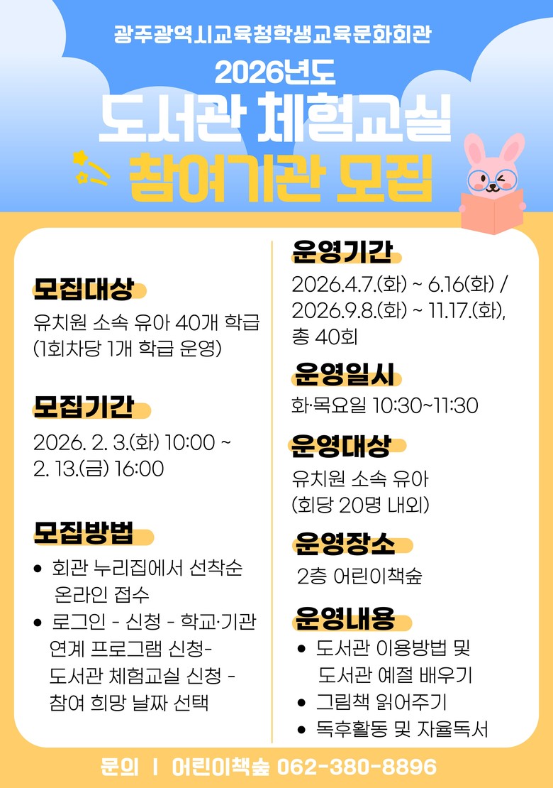 자세한 내용은 회관 누리집(https://lib.gen.go.kr/gecs/) 또는 학생교육문화회관 어린이책숲(062-380-8896)에서 확인하면 된다.
