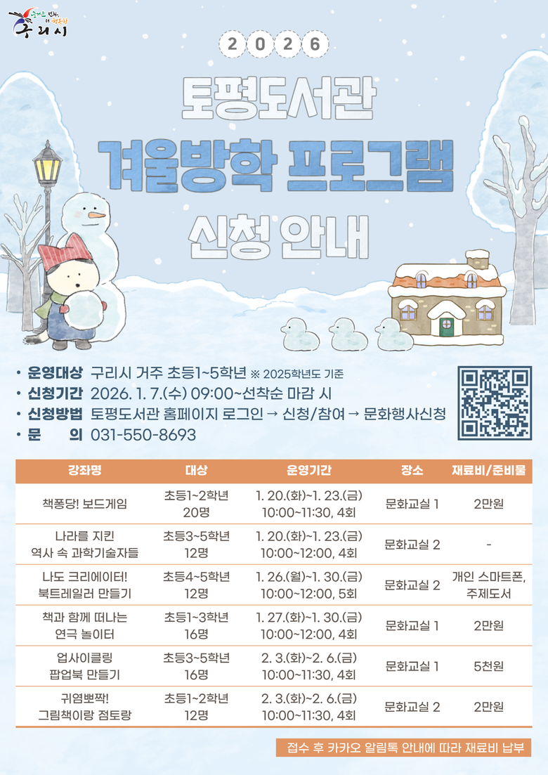 구리시 관계자는“겨울방학을 맞은 어린이들이 도서관에서 책과 함께 상상의 즐거움을 키우며 알찬 시간을 보내길 바란다.”라고 전하며, “구리시립도서관에서는 어린이들의 독서 습관 형성을 돕는 다양한 프로그램을 꾸준히 마련해 나갈 것”이라고 말했다.
