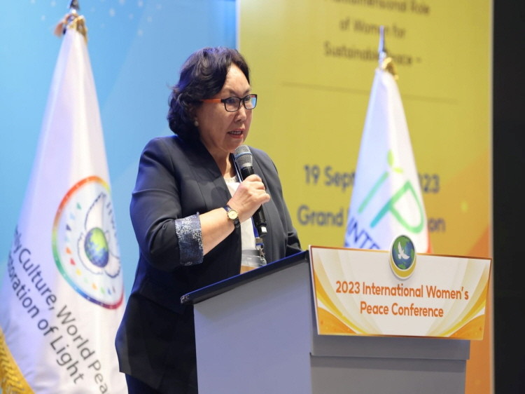▲몽골의 전 국회의원이자 IWPG 자문위원인 부데 문흐트야 모성영예훈장 어머니들협회 대표가 ‘2023 세계여성평화 콘퍼런스’에서 ‘지속가능한 평화의 제도화를 위한 여성의 역할’을 주제로 발표하고 있다.(제공=IWPG)