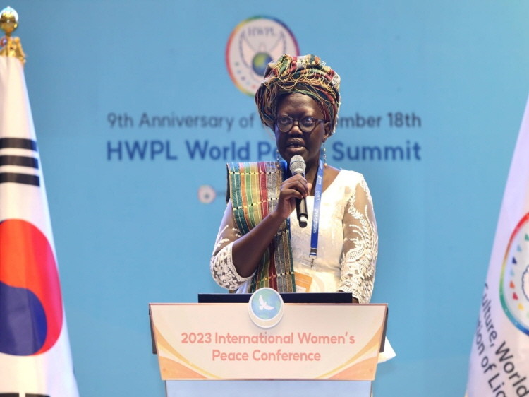▲에이야 벤자민 와릴레 남수단 여성아동복지부 장관이 19일 인천 중구 그랜드 하얏트 인천 웨스트 타워에서 열린 ‘2023 세계여성평화 콘퍼런스’에서 ‘지속가능한 평화의 필요성과 시급성’에 대해 특별 연설을 하고 있다. (제공=IWPG)