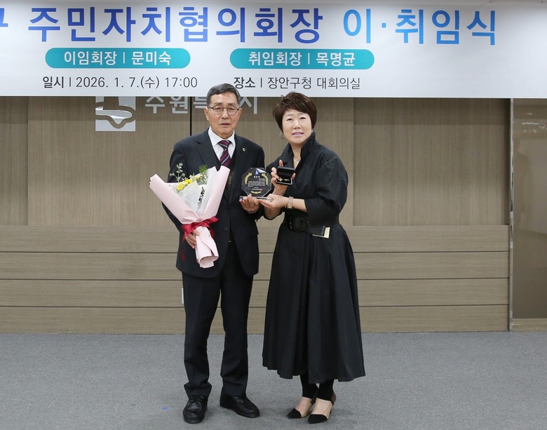 이번 이·취임식에는 각 동 주민자치회장과 위원, 장안구 단체장 등 100여 명이 참석한 가운데, 지난 1년간 장안구 주민자치 활성화를 위해 헌신한 문미숙 협의회장에 대한 감사를 표하고 새로 취임하는 목명균 협의회장에게 축하를 전하는 자리를 가졌다.