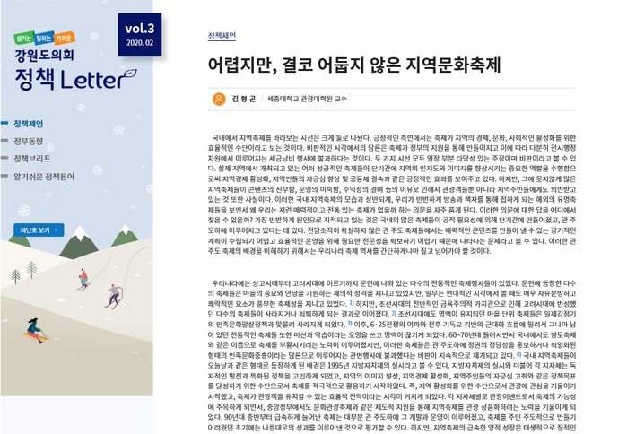 [강원도=세계타임즈 김민석 기자] 강원도 의회(의장 : 한금석)는 올해부터 다양한 정책정보를 담은 정책 Letter를 도의원과 도의회사무처 직원에게 제공한다. 월 2회, 연 총 24회 제공되는 본 정책 Letter는 e-book의 형태로 언제어디서나 해당 주소(URL)에 접속할 경우 접속기기에 따라 mobile용 또는 web용으로 확인할 수 있다.