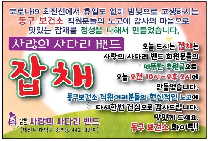 동구보건소 장선애 소장은 “오늘 사랑의 사다리 밴드 봉사단체에서 잡채를 지원해 주어서 큰 힘과 위안이 된다.”면서 “동구보건소는 코로나19 종식을 위해서 최선의 노력을 다하겠다.”고 말했다.