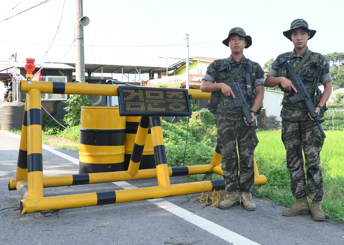 (사진 : 7월 28일 토요일 강화군 송해면 당산리 지역에서 검문소 근무 중 쓰러진 노인을 구한 이창헌 일병(왼쪽) 과 박창우 상병(오른쪽) <사진제공=김성규 하사>)
