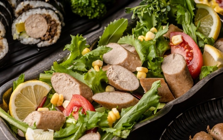 비건햄과 소시지를 활용한 감바스, 샌드위치, 아메리칸핫도그, 삼각주먹밥, 또띠아, 오무라이스 등으로 만들면 색다른 맛이 난다.여기에 소시지를 활용한 샐러드에 좋아하는 소스를 더하면 다이어터에게 건강한 한끼 식사가 된다.