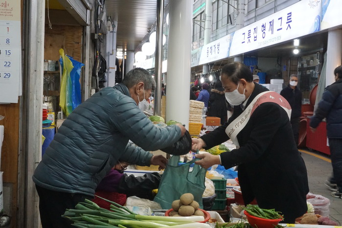 [동해시=세계타임즈 김민석 기자] 동해시의회(의장 김기하)는 27일 민족 최대의 명절 설을 앞두고 코로나19 장기화로 어려움을 겪고 있는 관내 전통시장에서 장보기 행사를 진행하였다.