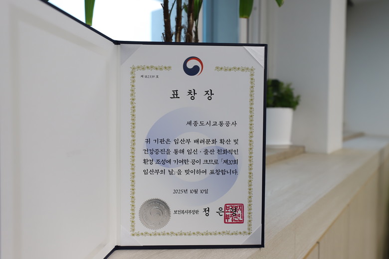 [세종 세계타임즈=이채봉 기자] 세종도시교통공사(사장 도순구)는 보건복지부 주관 제20회 ‘임산부의 날’을 맞아 임산부와 육아 가구를 위한 가족친화적 근무환경 조성과 교통복지 향상에 기여한 공로로 보건복지부 장관 표창을 수상했다.