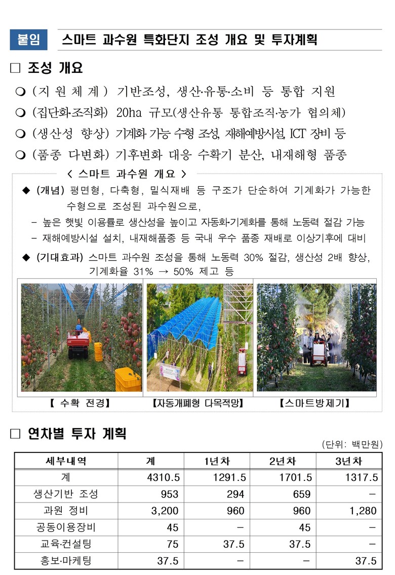 ▸ 스마트 과수원 특화단지는 20ha 내외 규모에 ❶ 용수원 개발 등 생산기반 조성, ❷ 품종갱신 및 ICT.재해예방시설 구축, ❸ 기계전정 트랙터 등 공동이용장비, ❹ 평면수형 등 재배기술 컨설팅, ❺ 신품종 홍보.마케팅 등을 개소당 3년에 걸쳐 종합적으로 지원