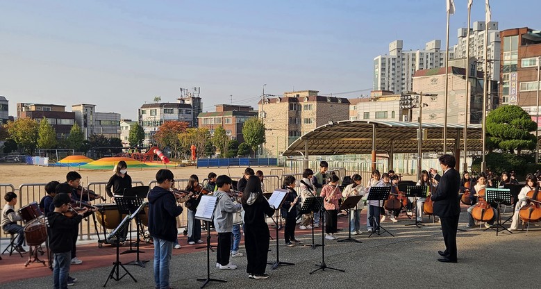 [시흥시 세계타임즈=송민수 기자] 시흥신일초등학교에서는 지난 10월 30일 오전, '가을의 멜로디'를 주제로 등굣길 음악회를 열어 학생들의 등굣길에 활기를 불어넣었다. 음악을 통해 서로 소통하고 협력하는 법을 배우고, 인성 함양과 예술적 감수성을 키우는 명문 교육 프로그램으로 자리매김한 시흥신일초 오케스트라는, 매년 정기연주회를 통해 꾸준한 성장을 거듭해온 실력을 바탕으로 이번 특별 공연을 마련하였다.