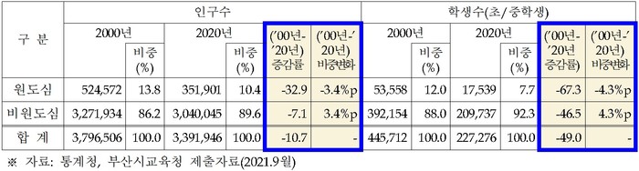 원도심 3개 지역이 인구감소지역으로 지정되어 지역의 위기로 거론되고 있지만, 학령인구 차원에서 접근하면 문제는 더욱 심각해진다. 지난해 9월 부산시교육청이 제출한 자료에 따르면, 부산 전체 초.중학생 중 원도심 학생 비중은 (2000년)12%에서 (2020년)7.7%로 크게 감소했다. 원도심의 전체 인구는 2000년 대비 33% 감소한 반면 초.중학생은 전체 인구 감소율의 2배가 넘는 67.3%가 줄었다. 또한, 지난해 부산시교육청이 그린스마트 미래학교 사업을 추진하면서 원도심 지역 소규모학교가 대상학교에서 배제된 문제가 불거졌고, 이에 원도심을 중심으로 학교통폐합 등의 문제가 지역 이슈로 다뤄지는 등 교육여건이 열악한 상황이다.