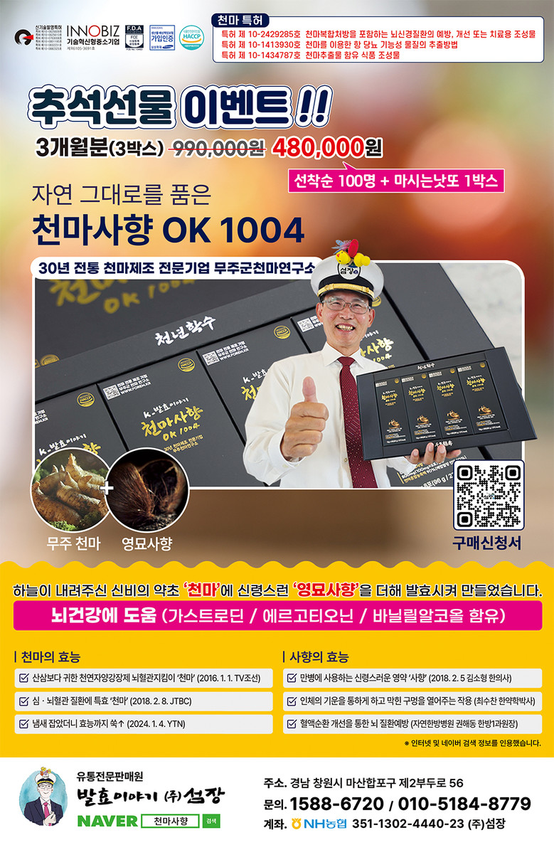 보유 특허(일부, 업체 제공)..가스트로딘 함량을 높이는 천마의 가공방법: 제10-0882325호 천마복합물 처방을 포함하는 뇌신경질환의 예방,개선 치료용 조성물 특허:제10-2429285호 항당뇨 기능성 물질 추출방법: 제10-1413930호 등 14건 ※ 특허는 원료·공정·조성에 관한 권리이며, 의학적 효능을 보장하지 않는다.