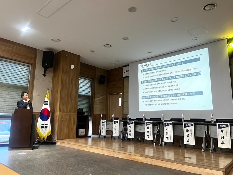 정초시 전 충북연구원장은 현재 교육과 지역 대학의 위기 상황에 대한 의견과 라이즈 사업, 글로컬대학 30이 성공하기 위한 지자체와 대학 간의 상호신뢰에 기반한 협력이 필요하며 대학 교육의 근본적 변화 필요성에 대해 말했다.