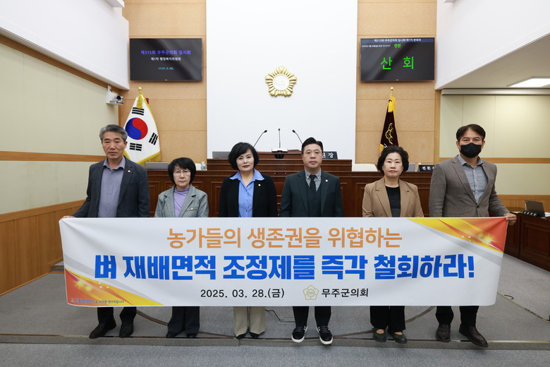 무주군의회는 지난 28일 열린 제315회 무주군의회 임시회에서 문은영 행정복지위원장이 발의한 「벼 재배면적 조정 제 철회 촉구 건의안」을 의원 만장일치로 채택했다.