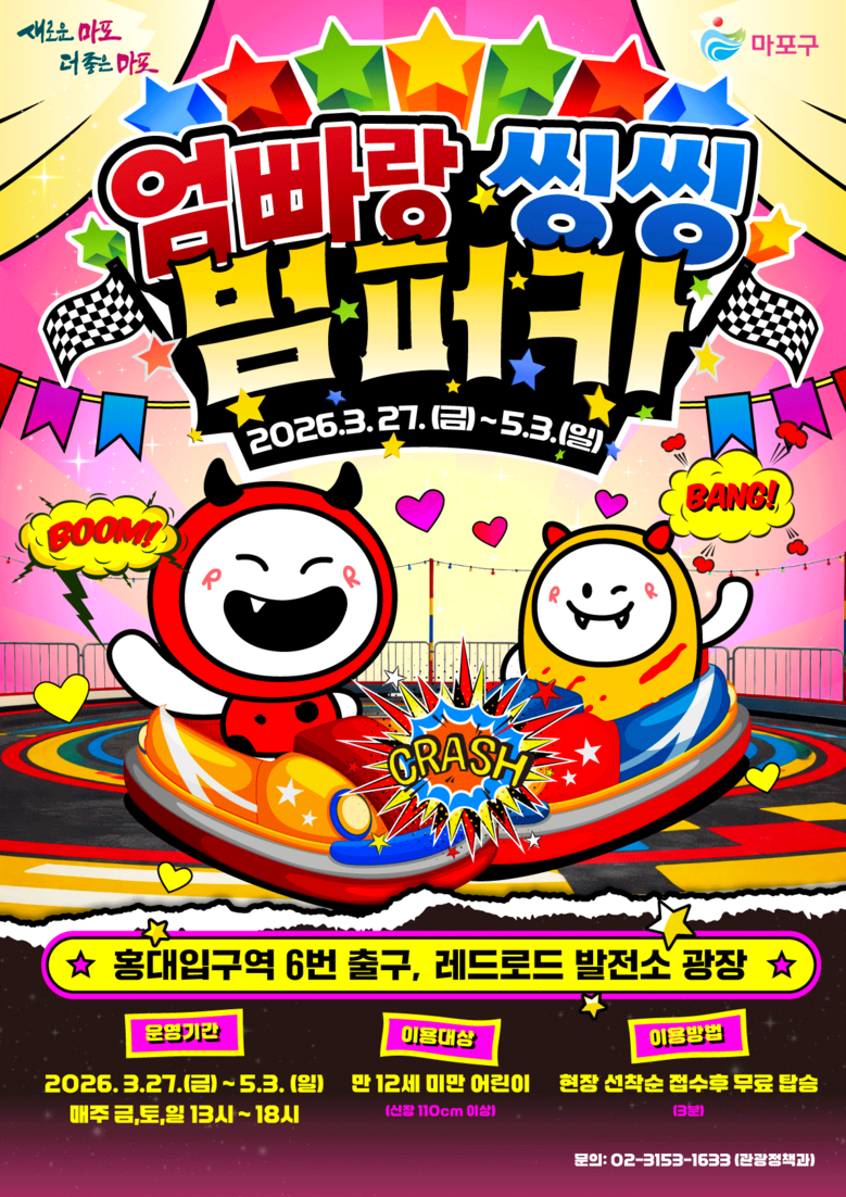 ‘엄빠랑 씽씽 범퍼카’에 대한 자세한 문의는 마포구청 관광정책과로 하면 된다.