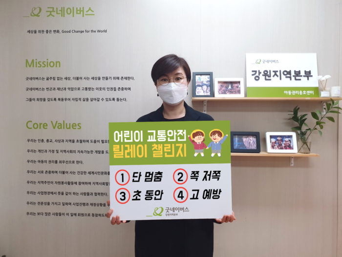 [강원도=세계타임즈 김민석 기자] 22일(월), 굿네이버스 강원지역본부 박미경 본부장은 ‘어린이 교통안전 릴레이 챌린지에 동참했다.