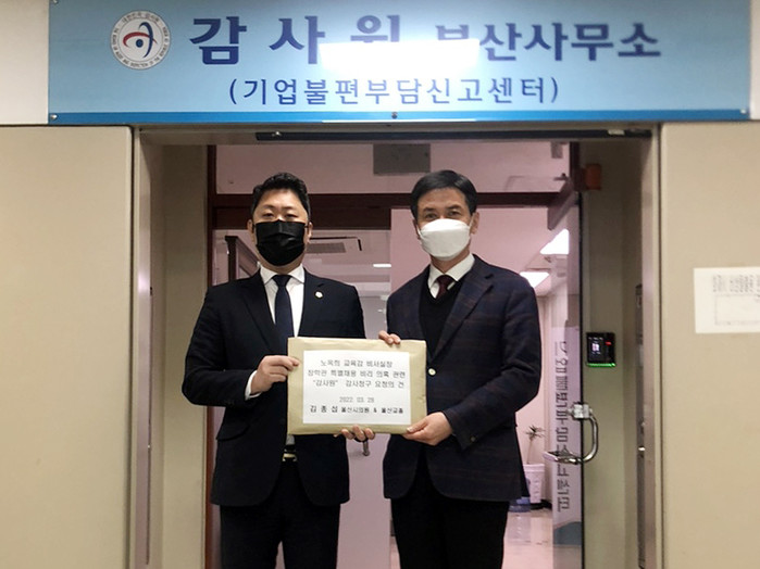 [울산=세계타임즈 이호근 기자] 울산광역시의회 교육위원회 김종섭 의원은 지난해 행정사무감사에서 언급한 노옥희 교육감 비서실장의 장학관 특별채용 비리 의혹과 관련하여, 28일 오후1시 1,750명의 서명을 받은 감사청구서를 감사원 부산출장소에 제출하였다.