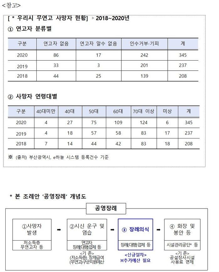 현재 무연고사망자는 구‧군에서 장례업체 등에 위탁하여 장례 의식없는 무빈소 ‘직장(直葬)’처리되고 있고, 기초생활수급자 등 저소득층에는 장제급여가 지급되고 있으나, 이 조례는 지자체가 저렴한 장례의식까지 포함하여 지원하는 ‘공영장례’제도의 체계와 사업추진의 기반을 마련하기 위한 것으로, 부산시에서는 동래구, 동구, 서구, 기장군 등 일부 기초지자체에서 시행해오고 있다.