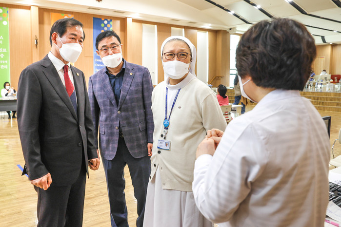 이날 대구시의회 장상수 의장과 김재우 의원(문화복지위원장, 동구1)은 지난 3월 4일부터 시작된 고위험 의료기관 종사자에 대한 아스트라제네카 백신 접종이 한창인 파티마 병원을 찾아, 병원 대외협력실장의 현장 설명을 들은 뒤, 김선미 병원장과 함께 접종 현장을 둘러보며 현장의 어려움을 듣고 공감하면서 개선방향을 함께 고민하는 시간을 가졌다.