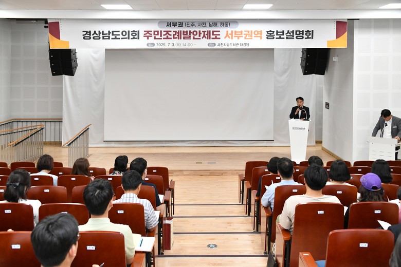 [경남 세계타임즈=최성룡 기자] 경상남도의회(의장 최학범)는 오늘(7월 3일) 사천시립도서관 대강당에서 주민조례발안제도 권역별 홍보설명회를 개최했다. 이는 주민이 직접 조례를 제안하는 주민조례발안제도에 대한 도민들의 이해도를 높이고 직접 참여를 확대하기 위해 도민들을 직접 ‘찾아가는’ 특강형 설명회로 추진하게 되었다.