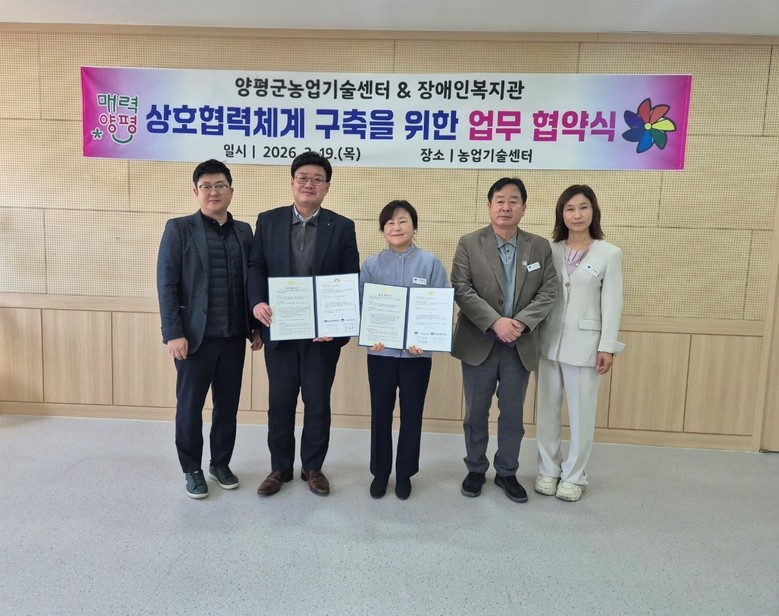 [양평군 세계타임즈=송민수 기자] 양평군(군수 전진선)은 지난 19일 농업기술센터 소장실에서 장애인복지관과 지역사회 장애인의 삶의 질 향상과 복지 증진을 위한 업무협약(MOU)을 체결했다고 밝혔다.