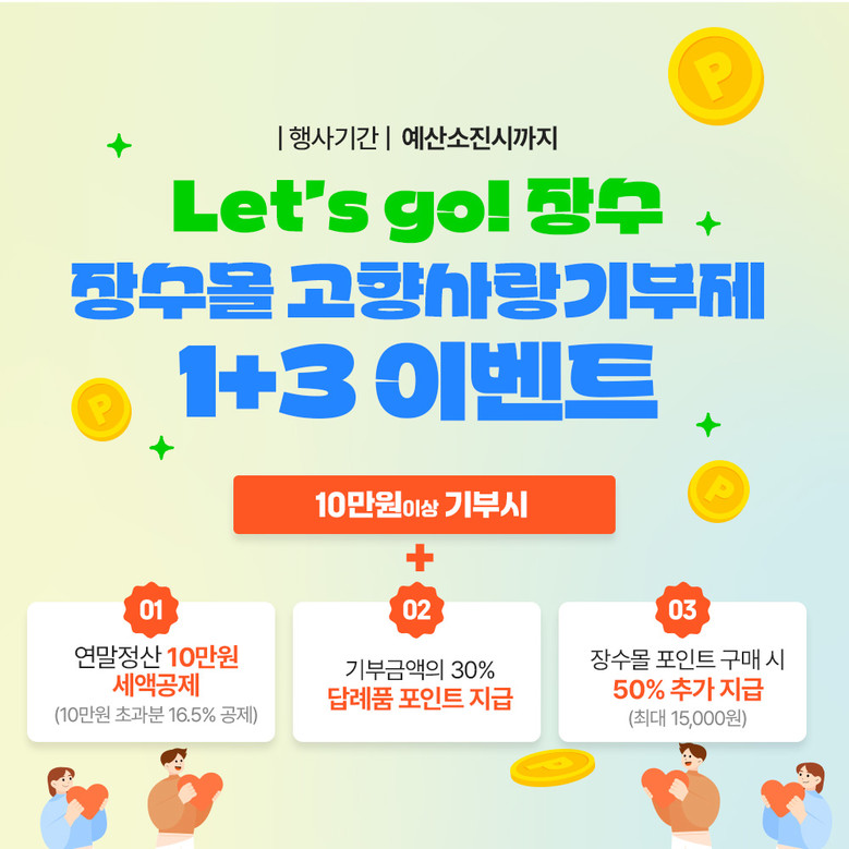 이번 행사는 2025년 연초 기부자를 포함해 선착순 200명을 대상으로 하며 장수 몰 포인트를 최대 1만 5천원까지 추가 적립해 주는 이벤트다.