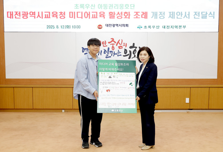[대전 세계타임즈=이채봉 기자] 대전광역시의회 이금선 의원(교육위원장, 국민의힘, 유성구4)은 12일, 시의회에서 초록우산 대전지역본부 아동권리옹호단으로부터 「대전광역시교육청 미디어교육 활성화 조례」개정 제안서를 전달받았다.