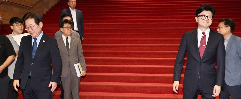 [세계타임즈 = 신상철 기자] 국민의힘 한동훈 대표와 더불어민주당 이재명 대표(왼쪽)가 1일 오후 국회에서 채상병 특검법, 금융투자소득세 폐지, 전 국민 25만원 지원법 등을 논의하는 여야 대표 회담을 마친 뒤 각자의 사무실로 향하고 있다. 2024.9.1