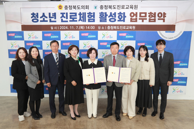 [충북 세계타임즈=이현진 기자] 충북도의회(의장 이양섭)와 충청북도진로교육원(원장 오병미)은 7일 충청북도진로교육원에서 ‘청소년 진로체험 활성화 업무협약’을 체결했다.