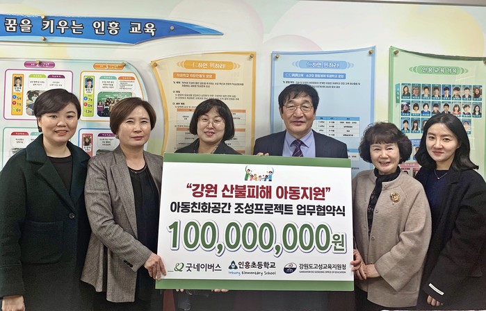 [강원도=세계타임즈 김민석 기자] 27일(수), 국제구호개발 NGO 굿네이버스(회장 양진옥)는 지난 4월 발생한 강원도 산불로 피해를 입은 아동을 지원하기 위하여 인흥초등학교(교장 김은숙), 고성교육지원청(교육장 허연구)과 함께 아동친화공간 조성 프로젝트 업무협약을 체결했다. 이번 협약식에는 김정미 굿네이버스 아동권리사업본부장, 박미경 굿네이버스 강원본부장, 김은숙 인흥초등학교 교장, 허연구 강원도 고성교육지원청 교육장이 참석했다.