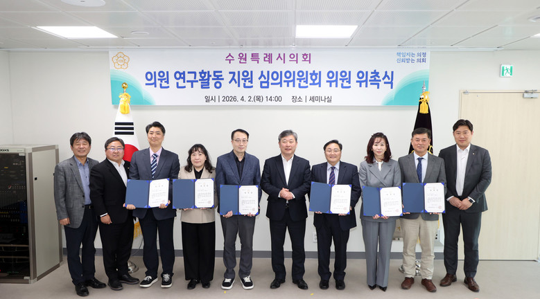 이번 위촉식은 최근 개정된 ‘수원시의회 의원 연구활동 지원 조례’에 따라, 연구 활동의 객관성과 전문성을 한층 높이기 위해 추진되었다. 의회운영위원회의 추천을 받은 행정, 경영, 교육, 도시, 외교 5개 분야의 전문가 6명이 신규 위원으로 선임되었다.