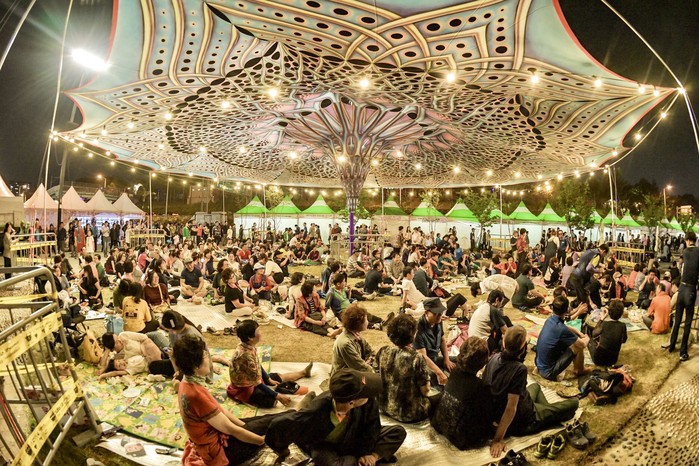 ☞ 25일(토) 서울장미축제를 찾은 방문객들이 중랑천 둔치에 설치된 대형 아트그늘막 아래 잔디밭에 돗자리를 깔고 시원한 강바람에 더위를 식히며 가족, 연인, 친구들과 함께 둘러앉아 피크닉을 즐기고 있다.