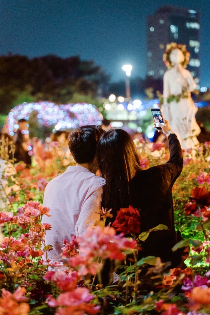 ☞ 25일(토) 저녁 서울장미축제를 찾은 연인이 야간 조명이 켜진 수림대 장미정원에서 장미꽃을 배경으로 사진을 찍고 있다.