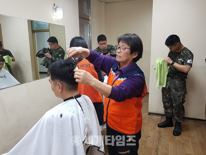 [대전=세계타임즈 이장성 기자] 다양한 봉사활동을 하고 있는 5천명 봉사단체 사랑의 사다리 밴드(리더 이정제)는 27일 오전 10시, 육군 제32사단 대덕대대(대대장 박종림)에서 군 장병들에게 미용봉사로 훈훈한 이웃사랑을 전했다.