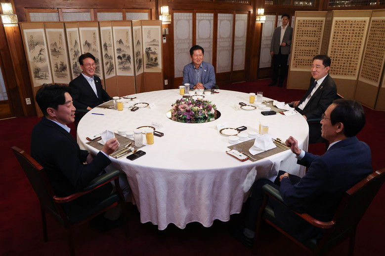 회동에 참석한 정 대표와 김 원내대표는 김 총리를 사이에 두고 환하게 웃으며 악수했다. 참석자 5명이 함께 기념사진을 촬영하기도 했다.이번 회동은 김 총리의 제안으로 이뤄진 것으로 알려졌다. 대통령실 관계자는 "당정대의 원활한 대화를 위해 만나는 자리"라며 "현안에 대한 의견을 나눌 것"이라고 설명했다.