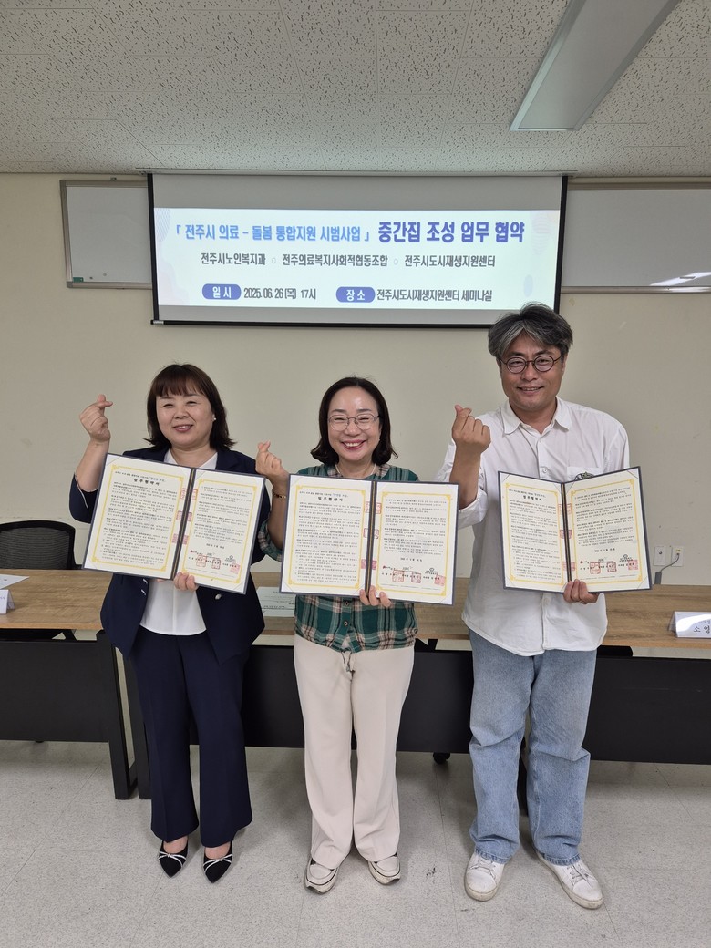 시와 전주시도시재생지원센터(센터장 소영식), 전주의료복지사회적협동조합(전무이사 고선미)은 26일 이같은 내용을 골자로 ‘2025년 중간집 조성을 위한 업무협약’을 체결했다.