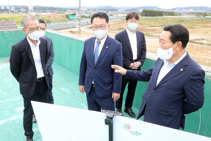 박문희 의장은 경제자유구역청 청장실에서 기획행정부장으로부터 에어로폴리스 2지구 조성사업 및 이주자택지 조성 추진현황을 보고받고 오송읍 만수리에 건립중인 국제-K뷰티스쿨 건립 현장을 점검했다.