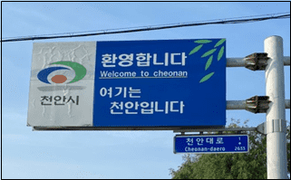 도로 표지판은 불특정 다수에게 노출되고 지속적인 홍보가 가능해 비용 대비 큰 효과 기대할 수 있다. 그러나 천안시로 들어오는 입구의 경계구역 표지판에는 심벌마크와 함께 여기부터 천안임을 알리는 문구만 있을 뿐이다.