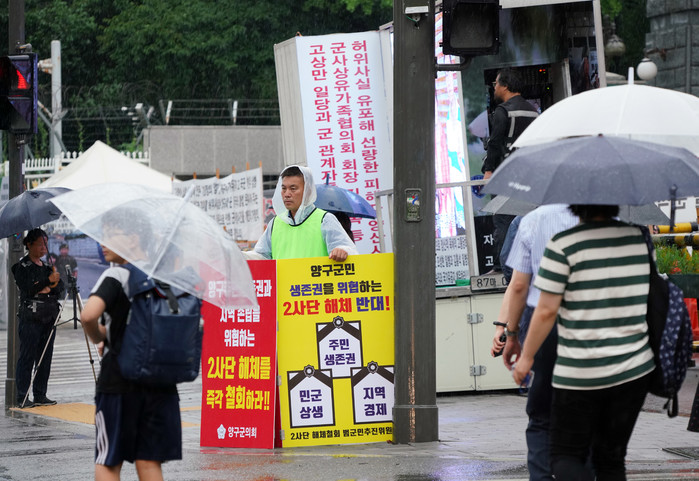[양구군=세계타임즈 김민석 기자] 박귀남부의장이 31일 서울 용산 국방부 정문에서 2사단 해체반대 1인시위를 하고 있다.